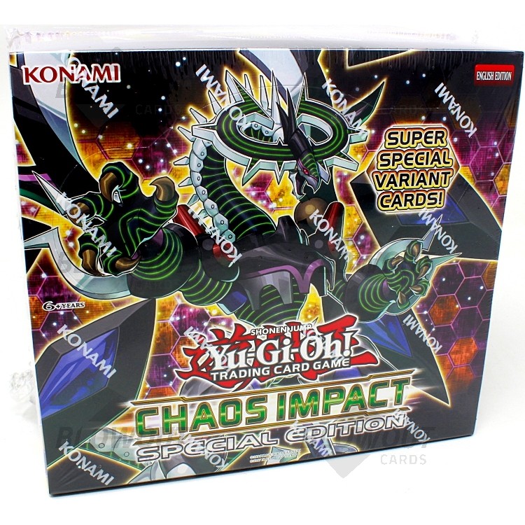 YGO YuGiOh TCG Chaos Impact Special Edition Booster Box - Brand New Sealed. Chaos impact special edition packs all the chaos from this falls booster set with an impact that wont break the bank. 3 Chaos Impact booster packs 1 of 2 Super Rare variant cards 1 of 2 foil preview cards Produced by Konami Condition.