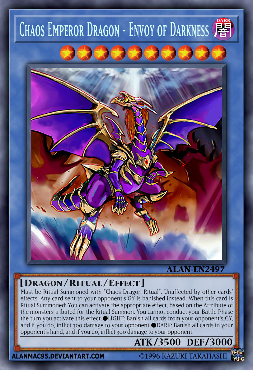 Card Chaos Emperor Dragon - Envoy Of The End in Advanced Format tournament play and Traditional Format tournament play. Chaos Emperor Dragon - Envoy of the End French database ID. Banlist has been unbanned.